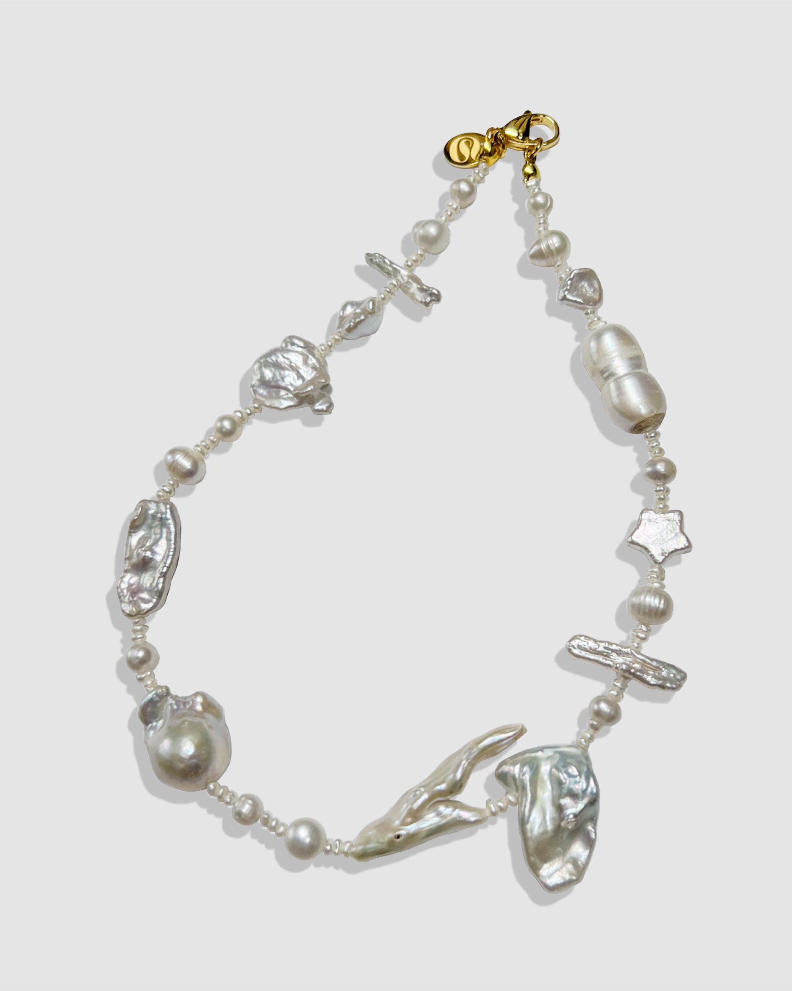 Made with the combinations of genuine baroque and keshi pearls. Finished with stainless steel metals in silver and gold.