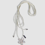 Long cord necklace with a white pearl flower pendant, designed to be wrapped and tied around the neck
