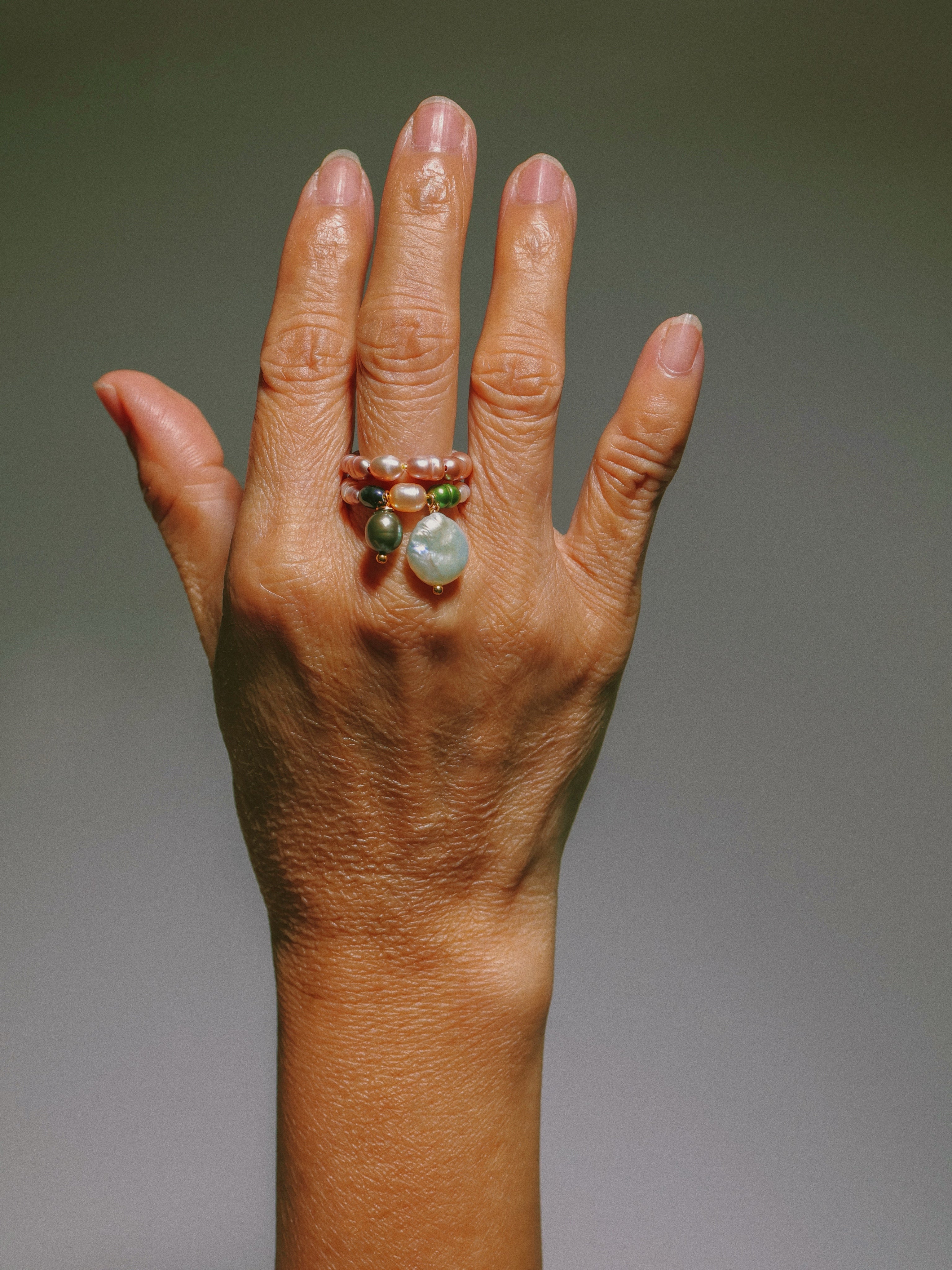 Pearl rings imagined as small treasures of the sea, designed to complement the Sa Isla bracelets and necklaces and perfect for stacking with other rings in the collection. Each piece carries the same warmth, stillness, and island spirit, crafted with baroque pearls that celebrate nature’s raw beauty.
