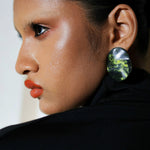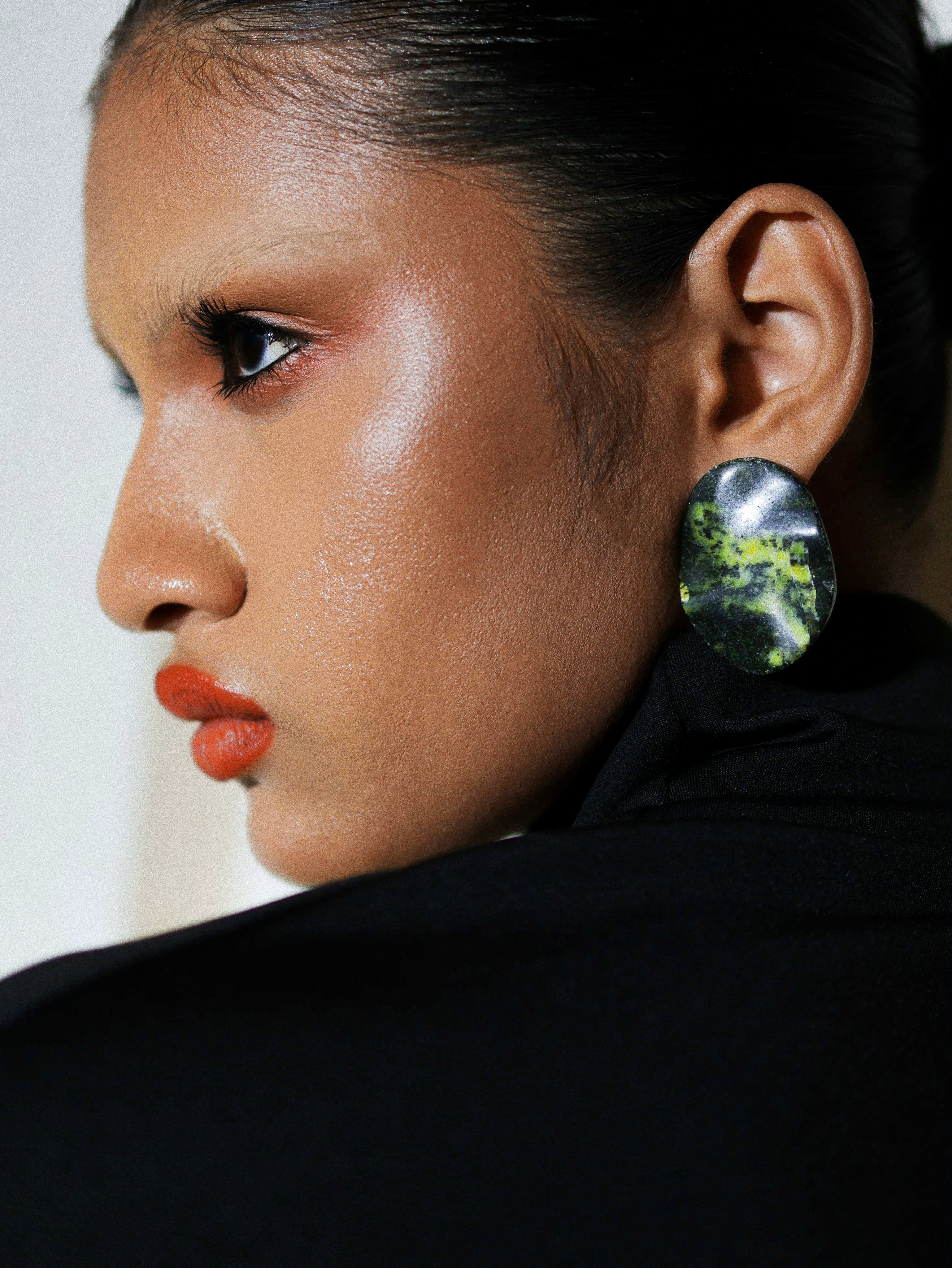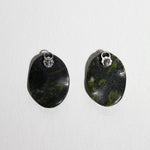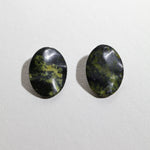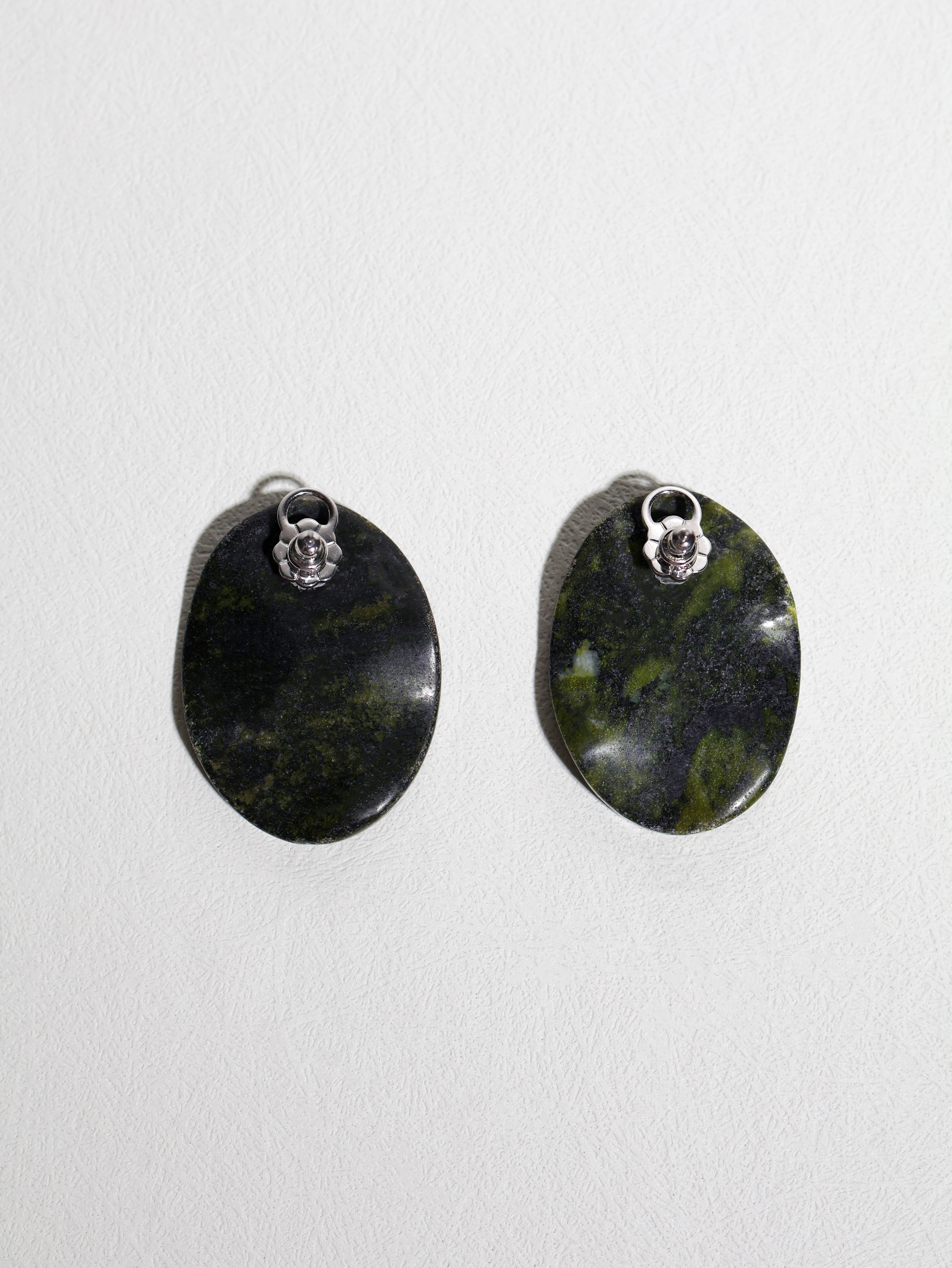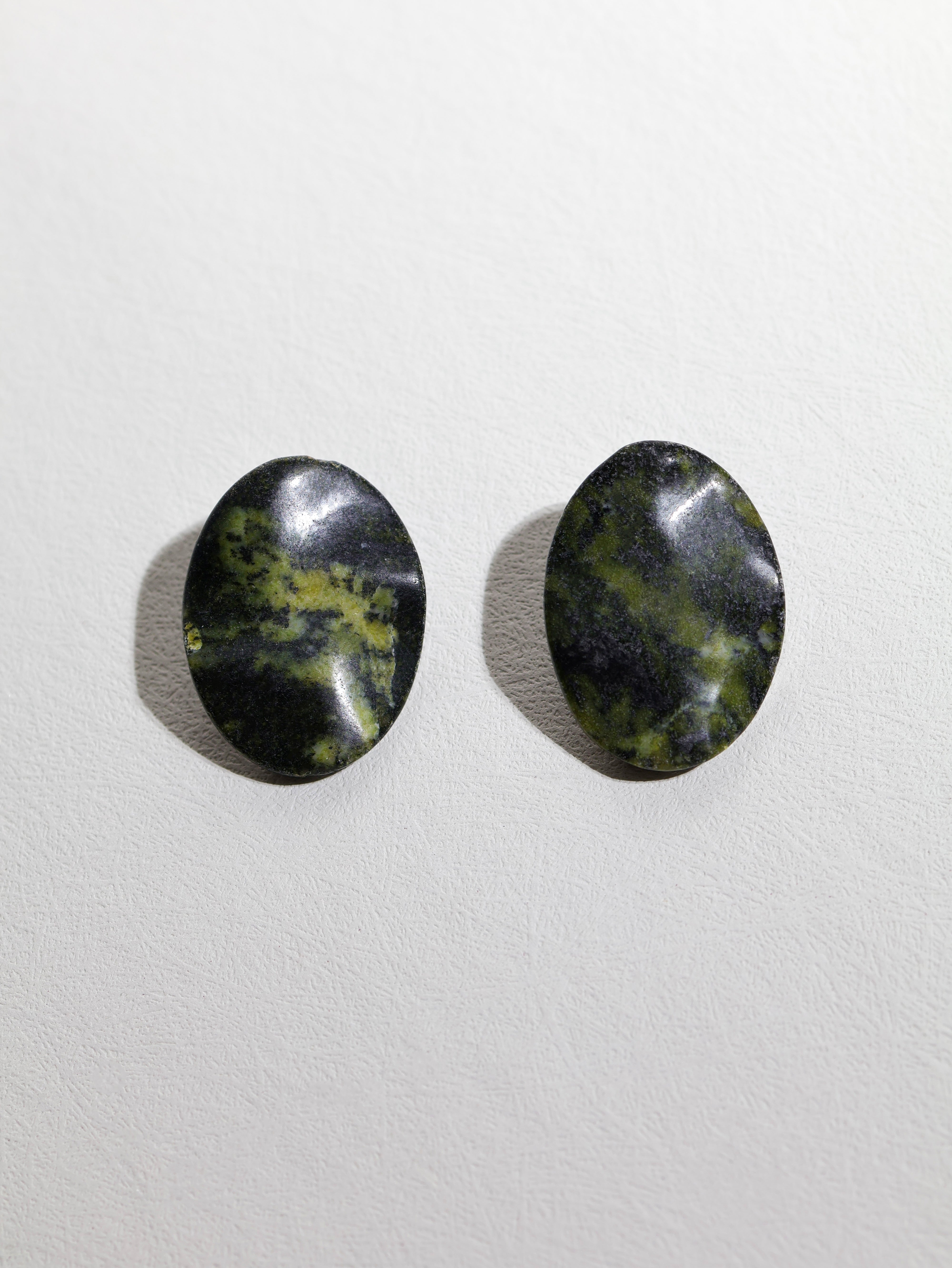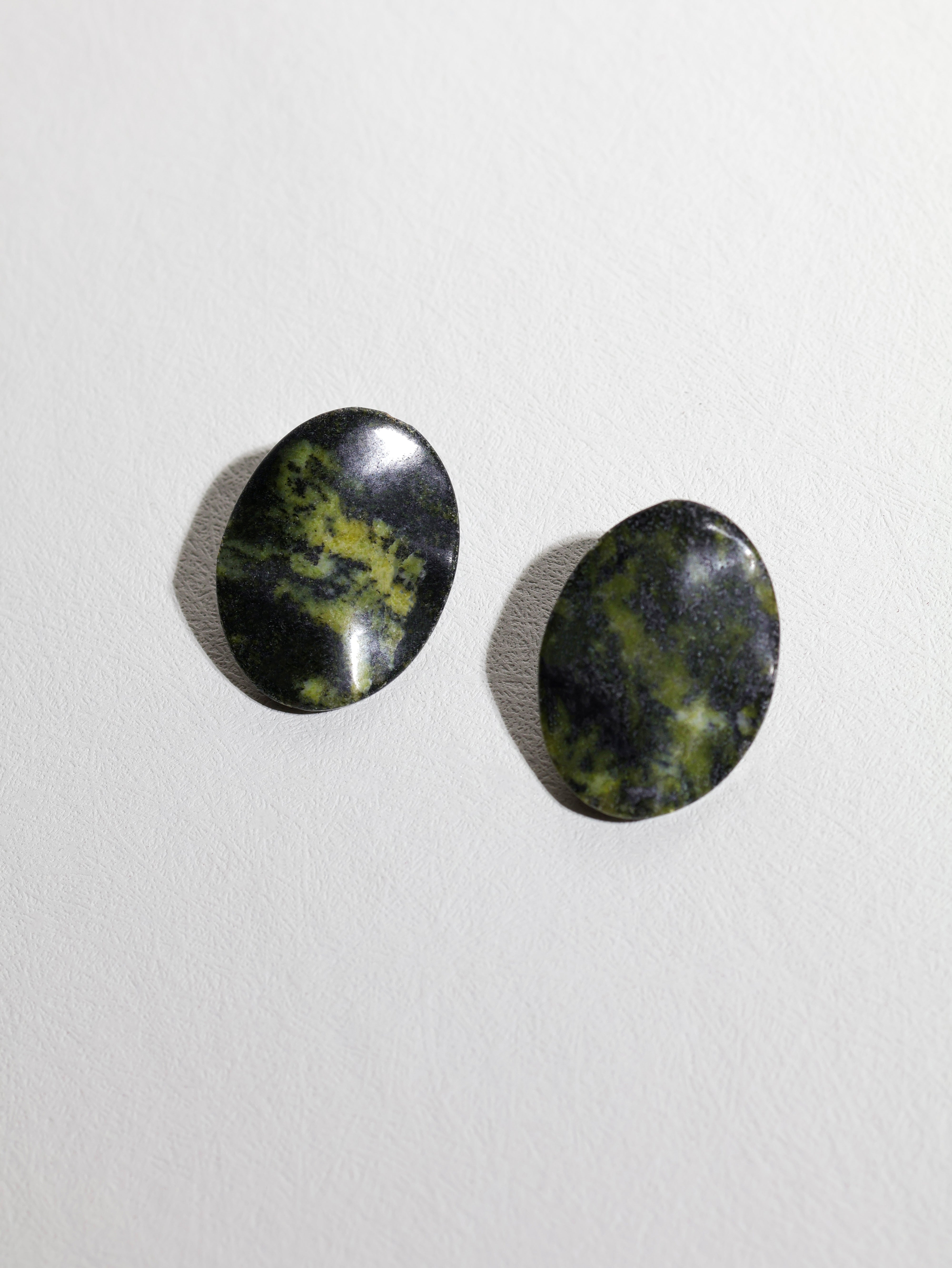 The Serpentinite Earrings bring a touch of the wild to geometric form. Each oval stone showcases the unique black-and-green marbling of serpentinite, creating a sculptural, grounded statement.