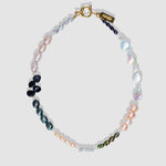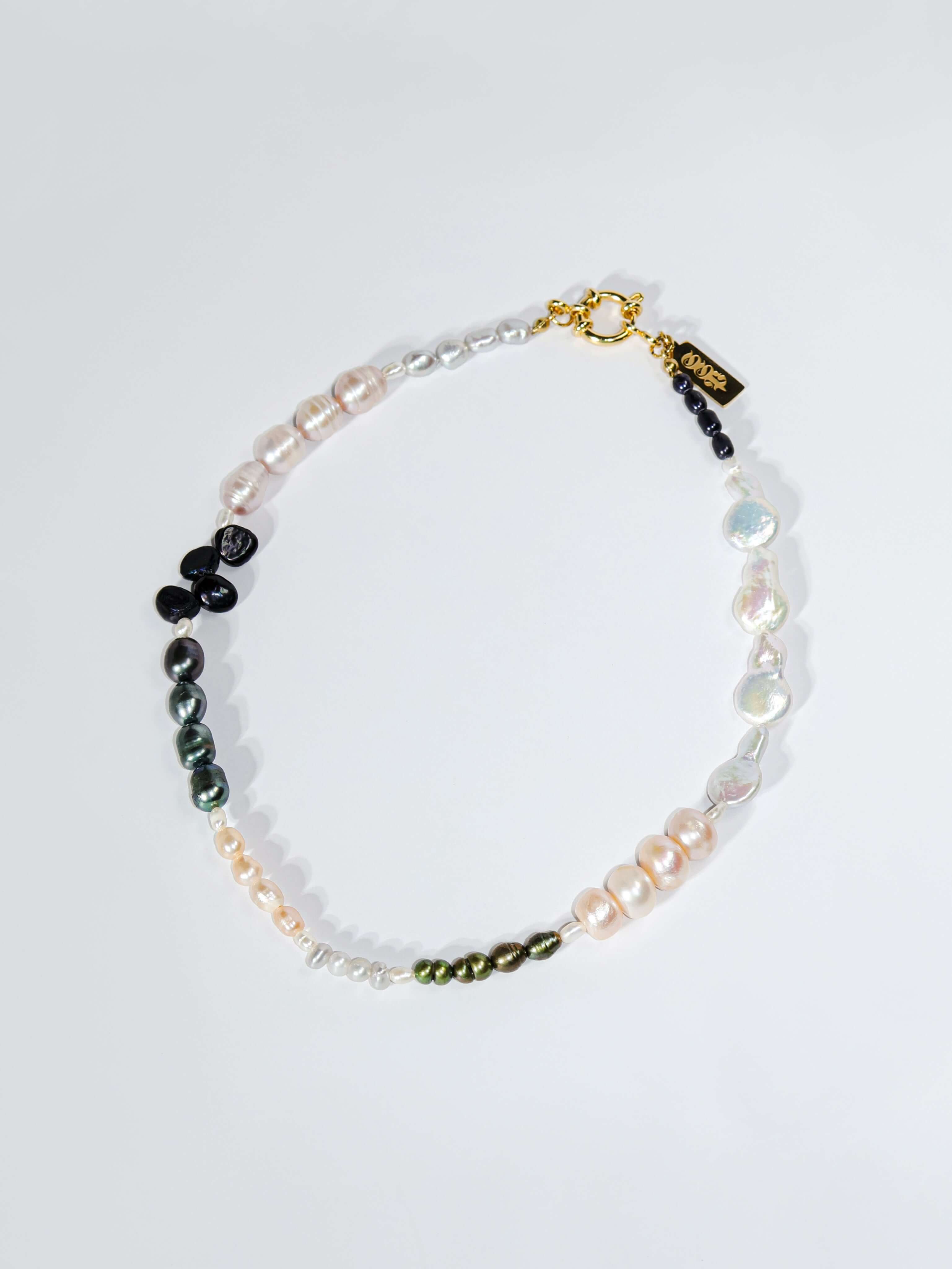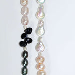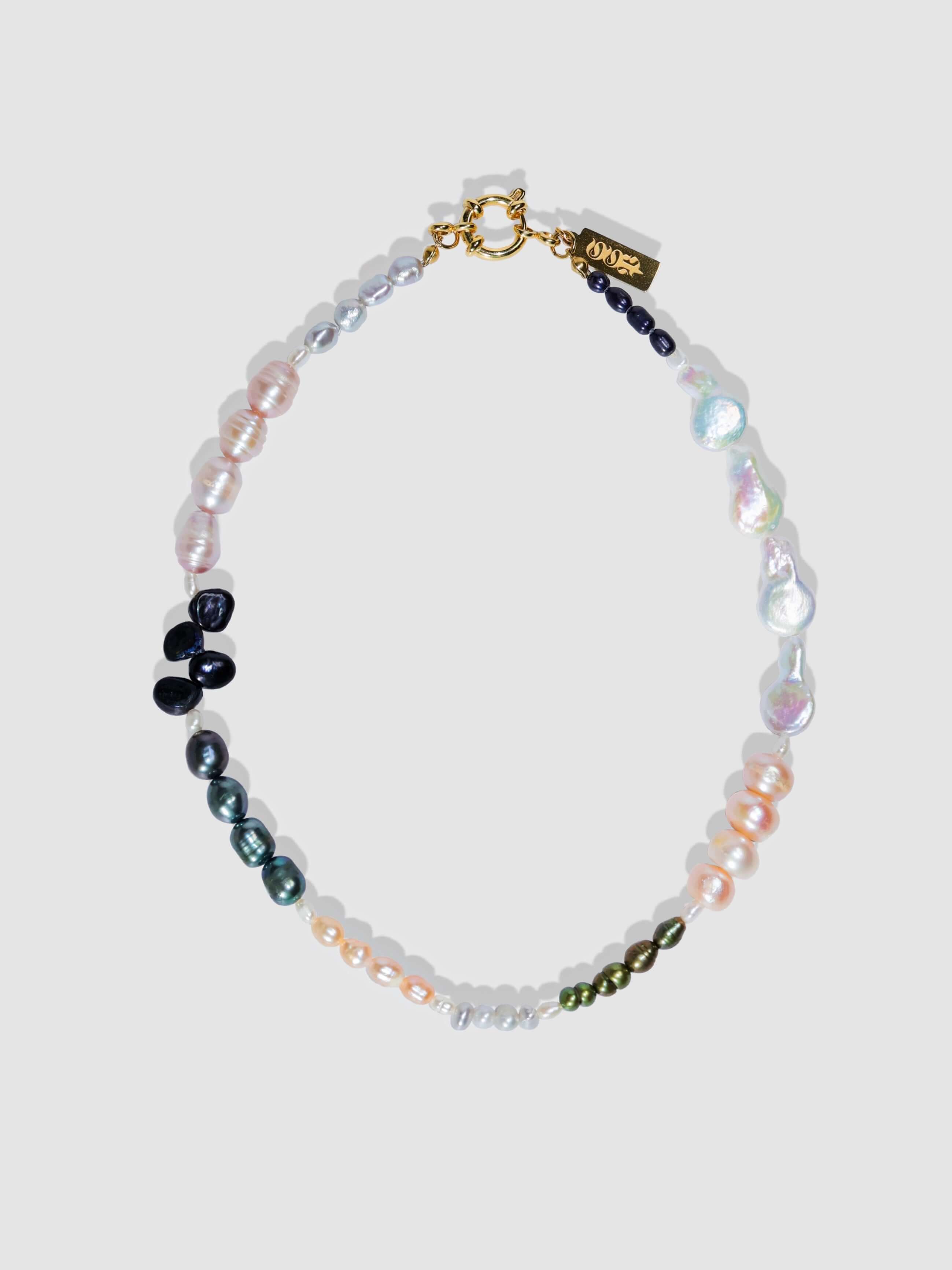A tropical paradise captured in pearls, this necklace features a striking array of black, green, pink, white, grey, and purple pearls, creating a vivid tapestry of color that reminds you of sun-kissed beaches and crystal-clear seas.