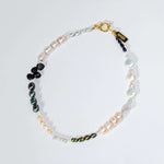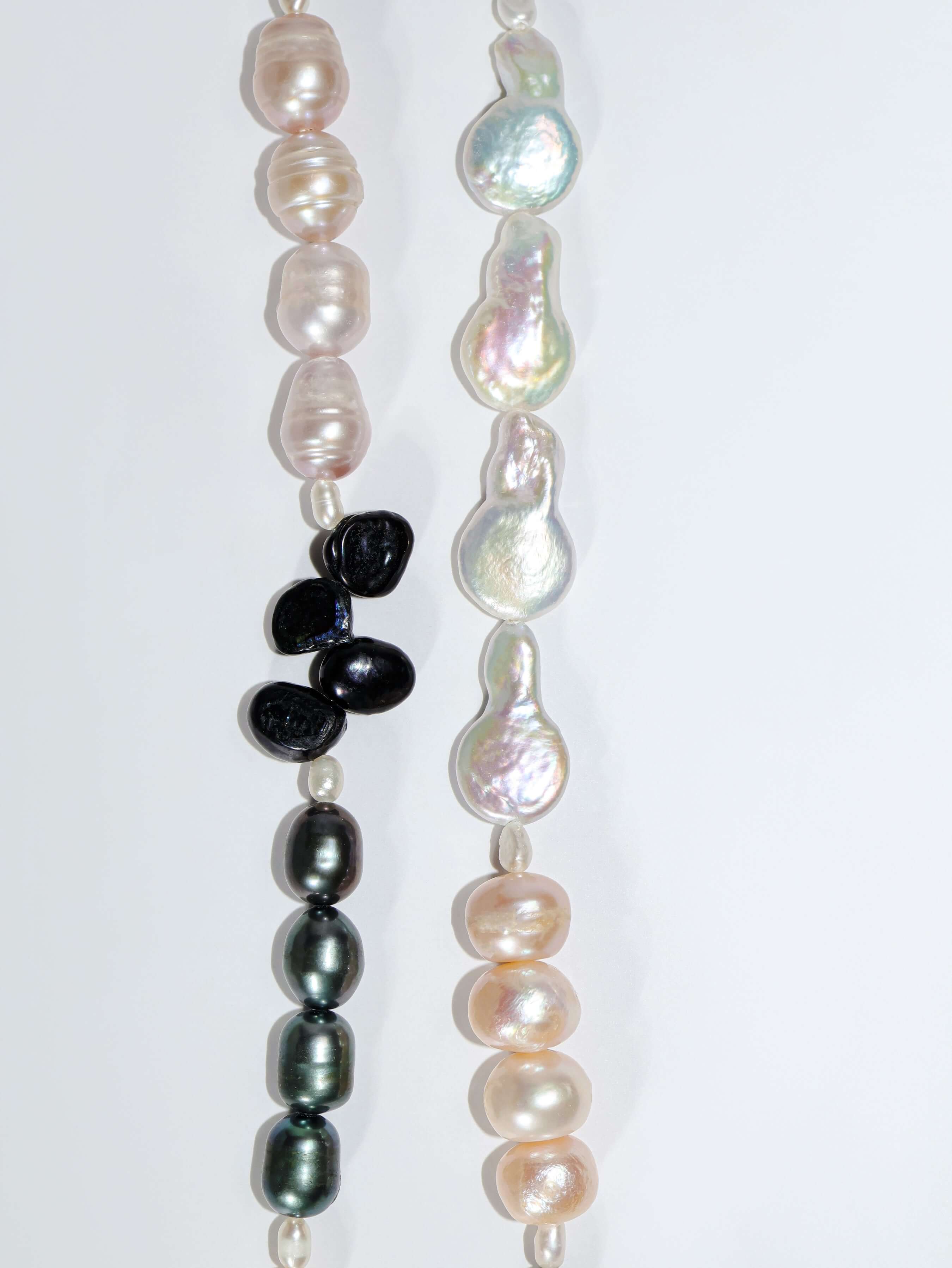 Combines rich black and green oval pearls with soft pink button pearls, an elegant white teardrop pearl, and misty shades of grey and purple